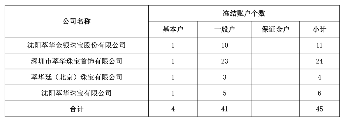 近期,萃华珠宝的财务危机引发市场广泛关注,公司及子公司多笔金融机构贷款逾期违约,截至2026年2月6日,公司及部分子公司累计借款逾期本金为2.54亿元,多家金融机构已提起诉讼或仲裁,公司及子公司45个主要银行账户被人民法院冻结,实际冻结累计金额为人民币472万元,对公司业务开展带来重大影响。