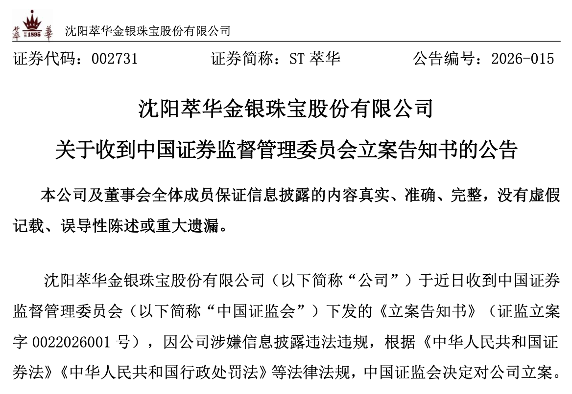 萃华珠宝称,目前公司部分经营活动和业务尚能开展。立案调查期间,公司将积极配合中国证监会的相关调查工作,并严格按照相关法律法规的规定和监管要求及时履行信息披露义务。